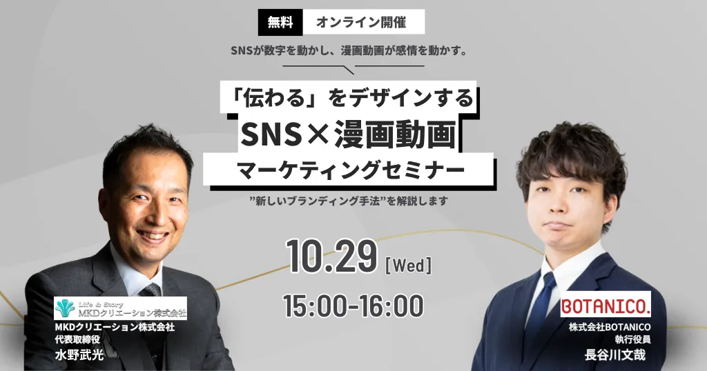 2025年10月29日(水)、SNS戦略と漫画動画を融合した新しいブランディング手法を提案するオンラインセミナーを開催します。現在、多くの企業がSNSを効果的に活用できていないと感じていますが、本セミナーでその課題を解決する具体的な方法を学ぶことができます。