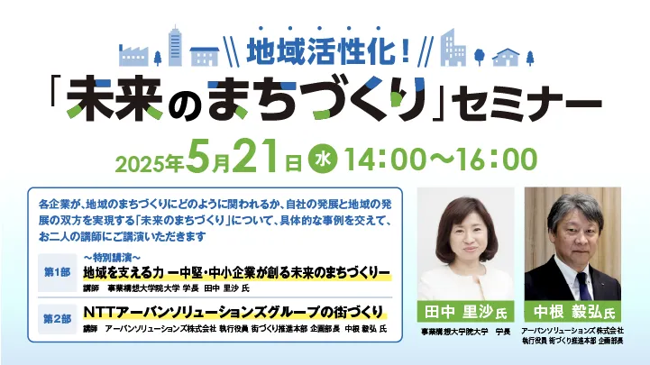 このセミナーは、オンラインで実施され、地域において企業がどのように関与できるかを探るものです。講師には、事業構想大学院大学の田中里沙学長と、NTTアーバンソリューションズ株式会社の中根毅弘執行役員をお迎えし、それぞれの観点からのお話を伺うことができます。