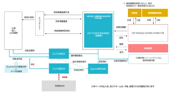 「HIF KESSAI GIVING FUND11号」の主な特徴は4点あります。一つ目は、全ての売掛債権に保証会社やQuantsによる売掛金保証が付保されていることで、投資が保全されている点です(公的機関までの債権を除く)。二つ目は、デフォルト率が0.04%未満という実績のあるQuants独自のAIモデルを基に、人工知能による自動与信審査を行い、選定された売掛債権が投資対象となります。三つ目は、HIF FUNDの他の号と同様、Quantsとの資本関係がないため、倒産隔離されています。四つ目として、ファンドから生み出される収益の一部を片親家庭や動物保護活動に寄付することが挙げられます。