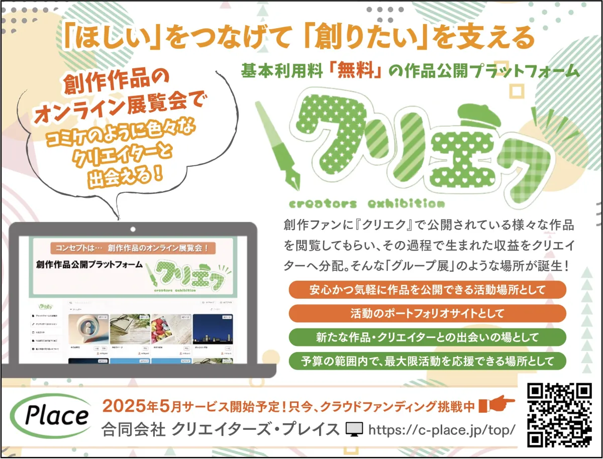 合同会社クリエイターズ・プレイスが提供する『クリエク』は、創作活動を行うクリエイターにとって、非常に画期的なプラットフォームです。このプラットフォームは、作品の無制限公開と同時に収益化が可能であり、従来のプラットフォームでの制約を克服することを目指しています。実施中のクラウドファンディングは2025年4月30日まで。興味がある方はぜひ参加してみてください!