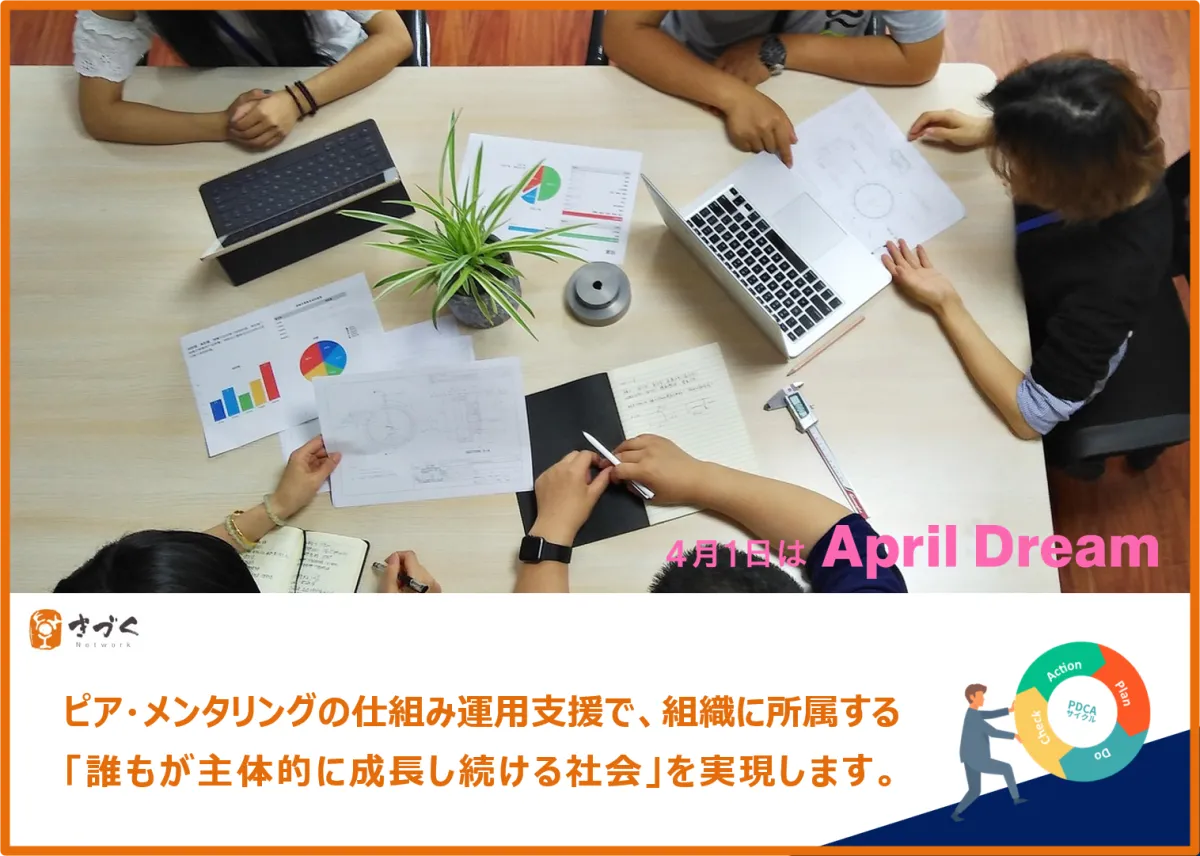 私たちの取り組みは、「April Dream」というプロジェクトにも賛同しており、4月1日を夢を発信する日としています。私たちが描く未来は、あらゆる企業において、すべての人が夢を追いかけられる社会です。