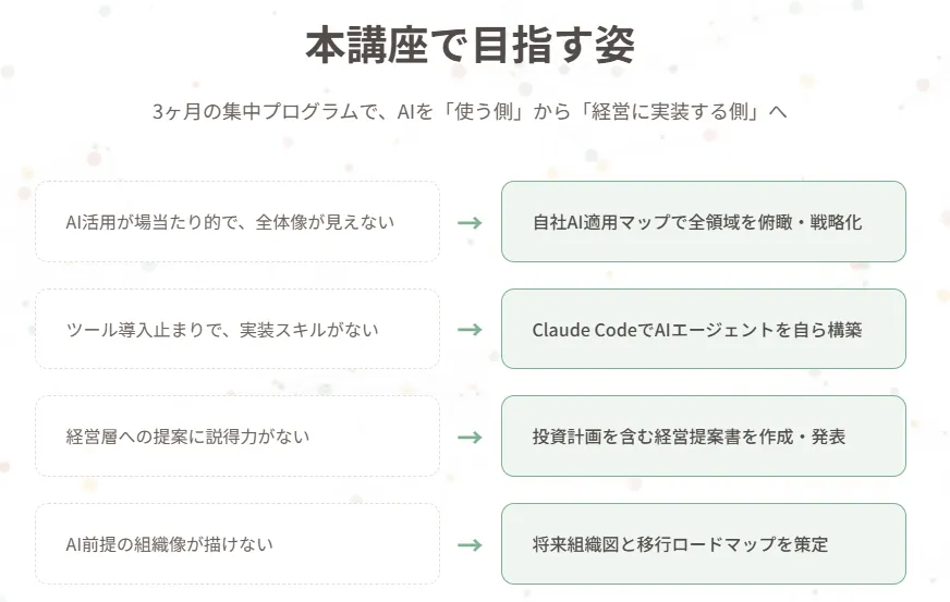 また、受講には私用PCの使用が必要で、実際の演習を通じて具体的なスキルを習得します。業務環境に縛られず、自由にAIツールを活用した学びの場を提供します。