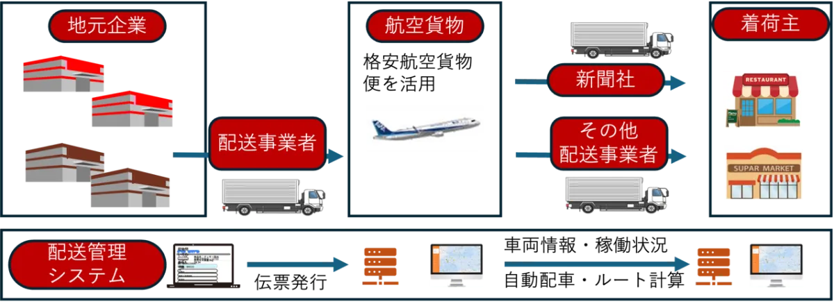 当日配送の実現:従来数日かかっていた配送を航空便に切り替え、迅速に新鮮な農産物や海産物を消費地に届けます。