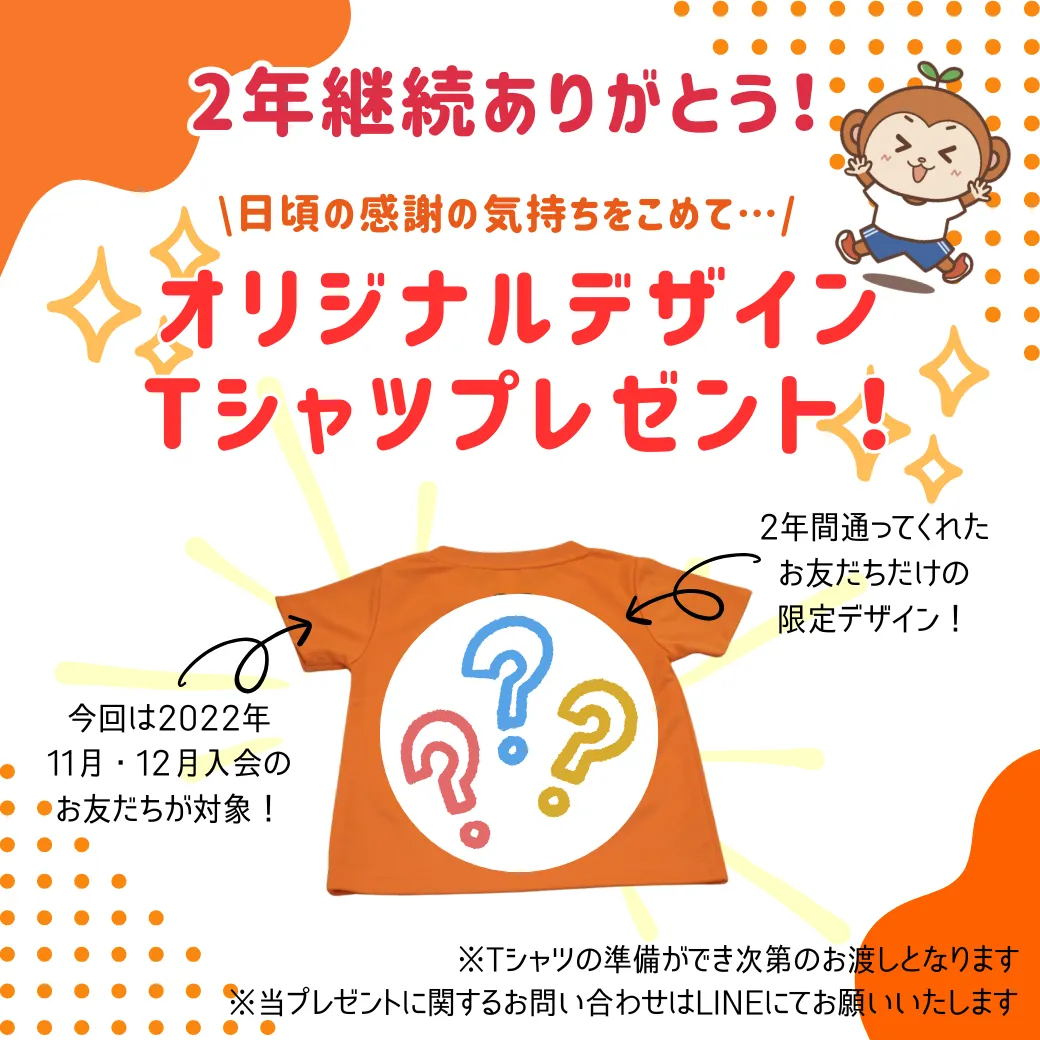 今回のプレゼントは、2年間継続的に通っているお友達を対象としたオリジナルTシャツです。特に2022年11月および12月に入会したメンバーが対象となります。この記念すべきオリジナルTシャツは、特別なデザインで作成され、日頃のご愛顧に感謝の気持ちを込めた一品です。