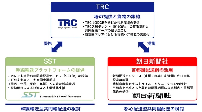 TRCは、都心型物流の拠点として、多数の事業者が集まる特性を活かし、持続可能な共同輸配送ネットワークの構築に取り組んでいます。この中で、SSTは安定した輸送力の確保や環境に配慮したサプライチェーンの実現を目指します。一方、朝日新聞社はその広範な配送ネットワークを駆使して、地域密着型の物流サービスを提供します。
