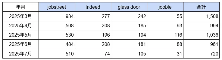 2025年7月末日現在での各求人サイト別の掲載数は以下の通りです。