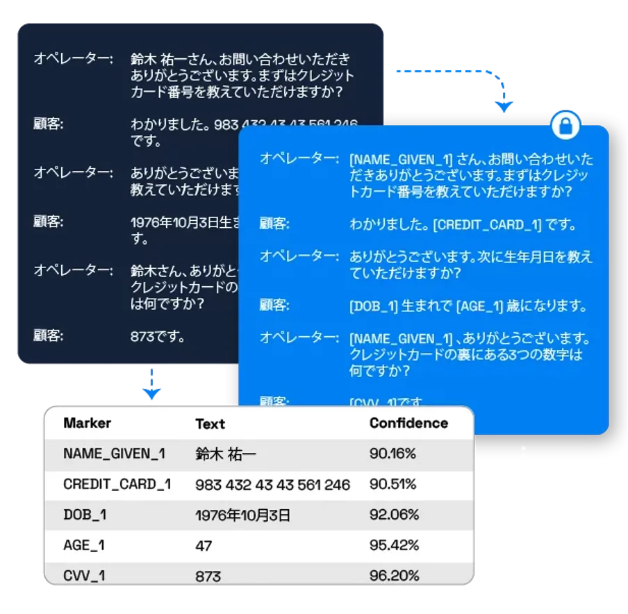 Private AIは、独自の機械学習技術を駆使し、データ内の個人情報や機密情報を自動的に特定し、秘匿化することを可能にしています。特に、日本語を含む52カ国の言語に対応する能力があり、日本特有のデータに関する高精度な処理が行える点がその強みです。
