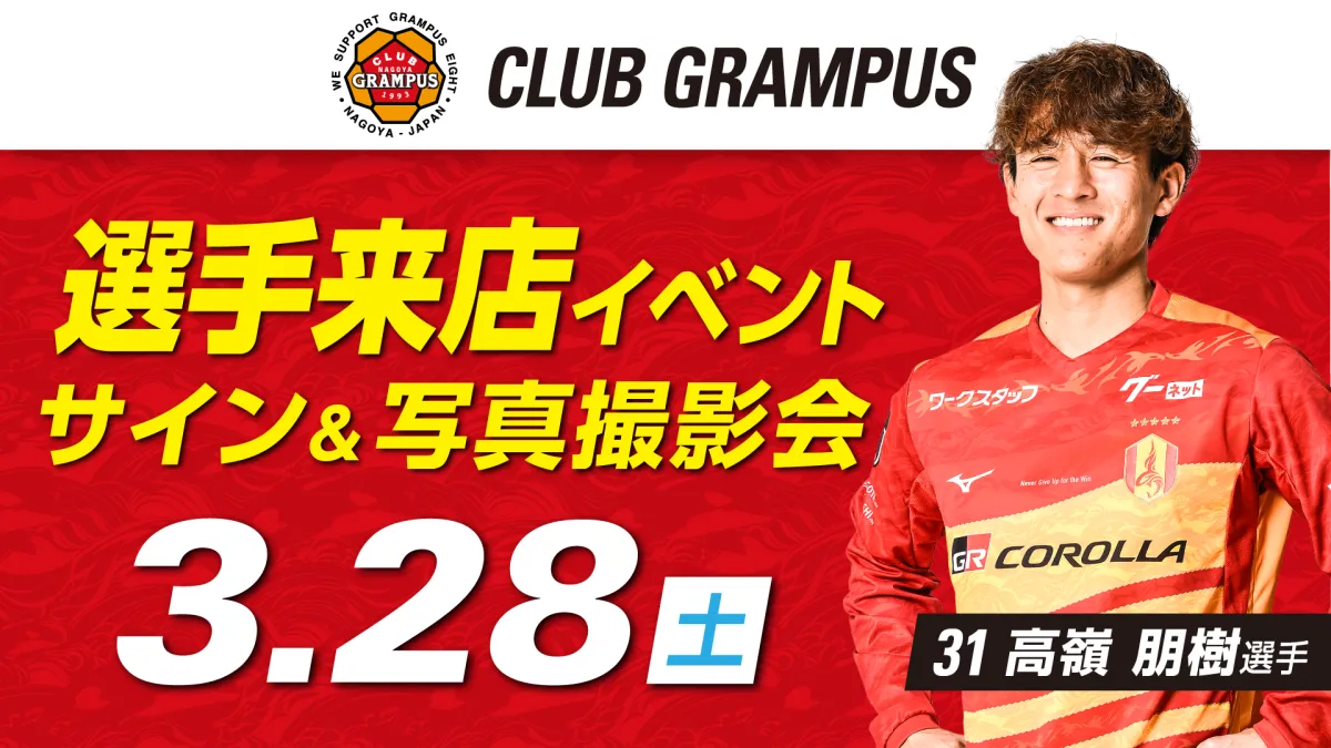 名古屋グランパスのファンにとって嬉しいお知らせがあります!3月28日(土)、名古屋グランパスオフィシャルグッズショップ「クラブグランパス」で特別なイベントが開催されます。この日は、新加入選手の高嶺朋樹選手が来店し、ファンとの交流イベントが行われます。