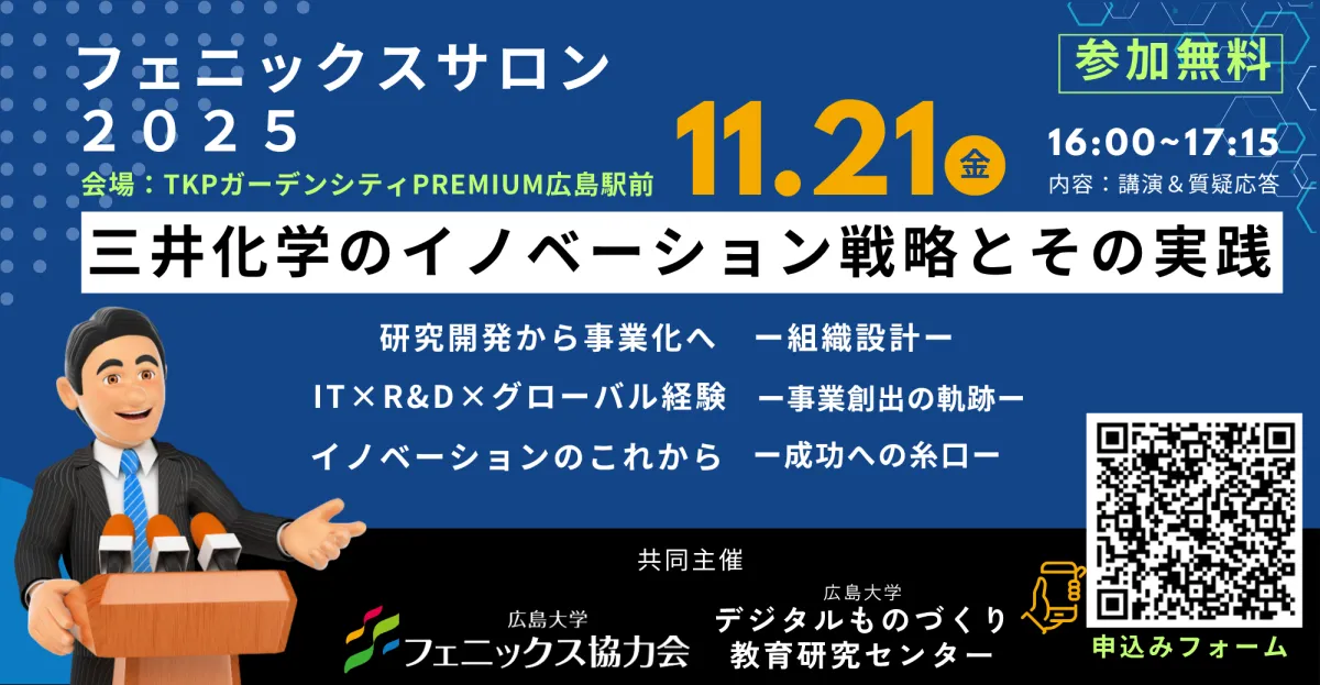2025年11月21日(金)、広島大学フェニックスサロンにて、「三井化学のイノベーション戦略とその実践」というテーマでセミナーが開催されます。このセミナーでは、三井化学のCTO(最高技術責任者)である表俊彦氏をお迎えし、研究開発から事業化への組織設計という視点で、企業のイノベーション戦略について深く掘り下げます。