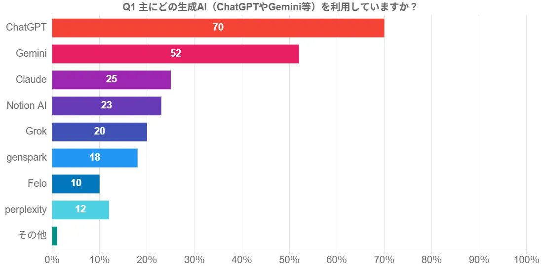 調査結果から、ユーザーの約70%がChatGPTを活用しており、次いで人気のツールとしてGeminiが52%のシェアを持っています。更にClaudeやNotion AI、Grokなども一定の使用率を示しており、ユーザーは複数の生成AIを組み合わせて利用するケースが多いことが分かります。