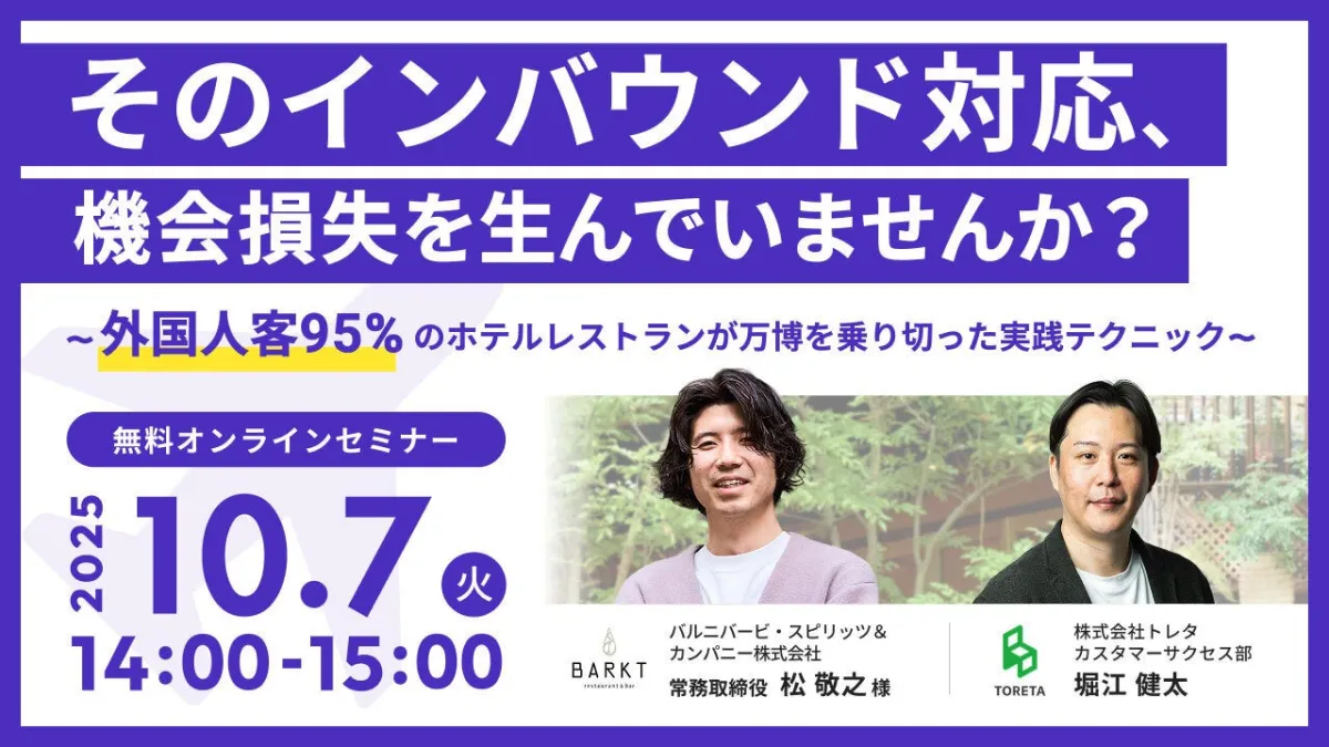 2025年に大阪で開催される万博を前に、インバウンド対応の重要性が高まっています。特に観光客が増加する中、飲食店をはじめとしたサービス業が適切な対応をしないと、機会損失につながる可能性があります。そこで、株式会社トレタが主催する「そのインバウンド対応、機会損失を生んでいませんか?」というオンラインセミナーが注目されています。セミナーでは、バルニバービ・スピリッツ&カンパニーの常務取締役、松敬之氏がゲストとして登壇し、インバウンド客を効果的に取り込むための実践テクニックを披露します。