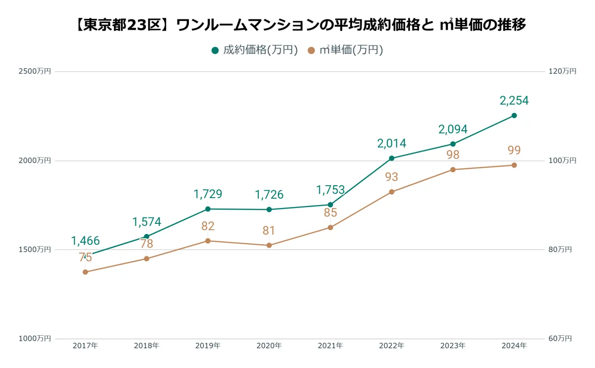 東京都心のワンルームマンション市場は近年目覚ましい変化を遂げています。株式会社TOCHUによると、2017年から2024年の間に、東京都23区で取り扱われたワンルームマンションの平均成約価格は、1,466万円から2,254万円まで上昇し、累計で788万円(約153.8%)の増加を記録しました。一方、賃料は78,316円から88,361円へと上昇したものの、その率は112.8%にとどまり、利回りは6.88%から4.99%と低下傾向にあるのが実情です。