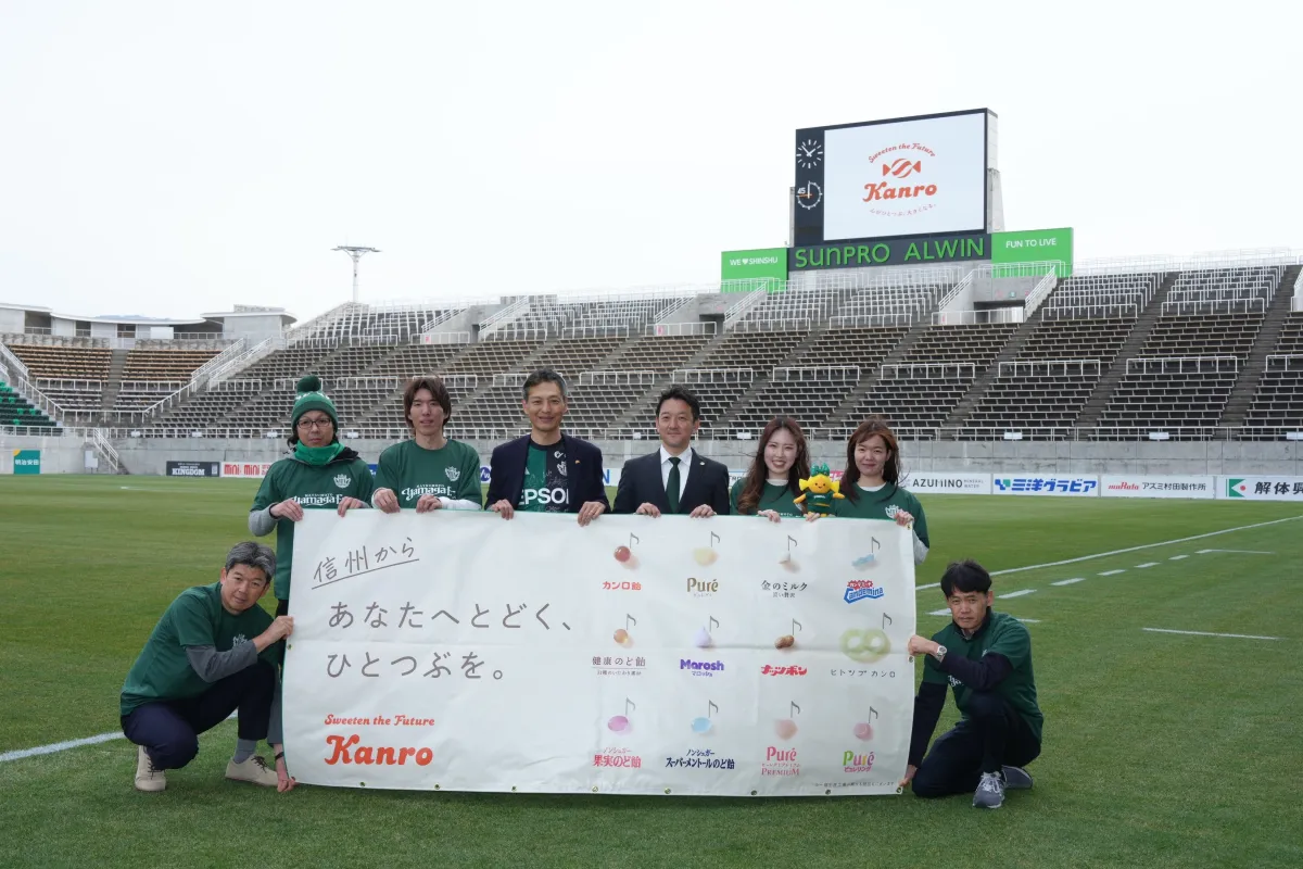 2026年2月、カンロ株式会社と松本山雅FCはオフィシャルパートナー契約を結び、信州エリアにおける地域貢献活動を一層強化することを発表しました。この契約を記念して、松本山雅FCのホームスタジアム「サンプロアルウィン」にて「バナーお披露目・キャンディ進呈式」を実施。カンロの村田哲也社長と松本山雅FCの小澤修一社長が出席し、地域の住民とともに歩んできた取り組みを振り返りました。