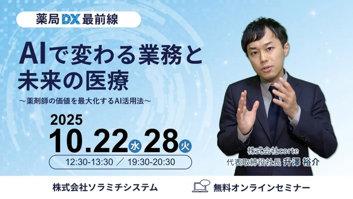 株式会社ソラミチシステムが主催する無料オンラインセミナーが、10月22日(水)と28日(火)に開催されることが発表されました。このセミナーのテーマは「薬局DX最前線:AIで変わる業務と未来の医療」です。