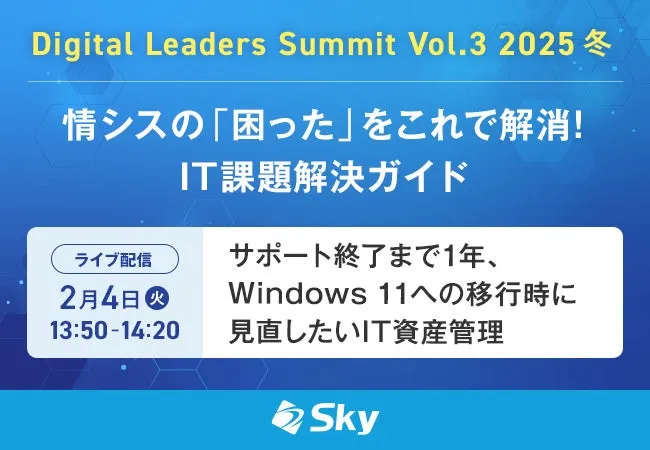 Sky株式会社は、2025年2月3日から5日まで開催されるライブ配信セミナー「Digital Leaders Summit Vol.3 2025冬」に協賛します。本イベントは、IT関連の課題解決を目的としており、特に「サポート終了まで1年、Windows 11への移行時に見直したいIT資産管理」というテーマのセミナーを実施します。