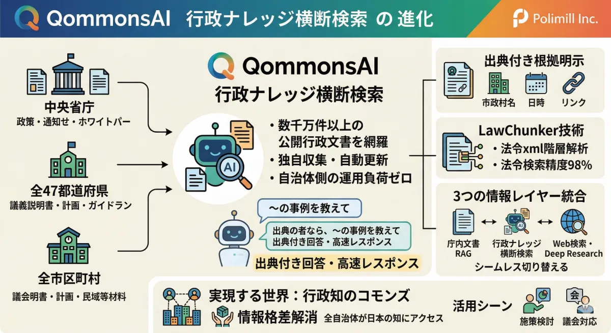 近年、行政機関はさまざまな情報を市民に提供し、透明性を高める努力をしています。しかし、日本全国の48,000以上におよぶ自治体や中央省庁からの膨大な情報を一手に扱うのは容易ではありません。そこで、Polimill株式会社が開発した「QommonsAI(コモンズAI)」が登場しました。この行政向け生成AIは、全国を網羅した行政文書の検索機能を提供し、自治体職員の業務を一変させる可能性を秘めています。
