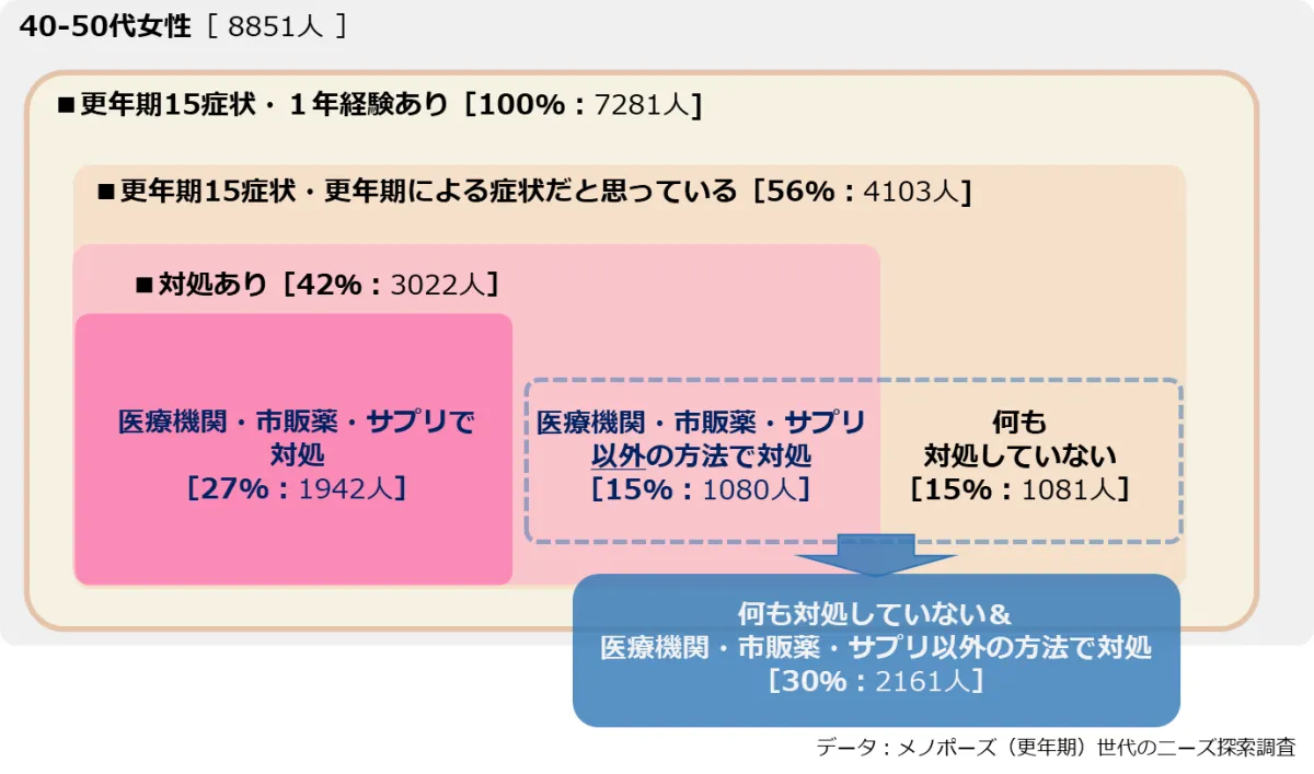 近年、女性の健康管理において注目されている「更年期」の問題。株式会社インテージヘルスケアが発表した調査データによると、40代から50代の女性たちの中で、実に約30%もの人々が更年期症状に対して何らかの対処を行っていないという実態が浮かび上がっています。この状況は、健康に対する意識が高まっている現代においては、決して見逃せない問題です。