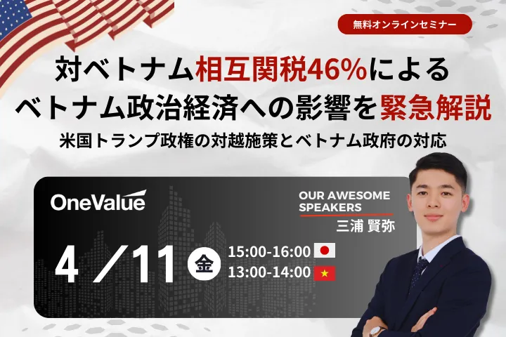 ONE-VALUE株式会社は、米国トランプ政権によるベトナムへの46%の相互関税に関するウェビナーを開催します。今後のベトナム経済に対するリスクと影響を知りたい方は是非ご参加ください。