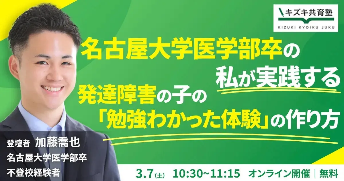 2026年3月7日(土)、株式会社キズキが主催する無料オンラインイベントが開催されます。このイベントのテーマは「名古屋大学医学部卒の私が実践する発達障害の子の『勉強わかった体験』の作り方」です。