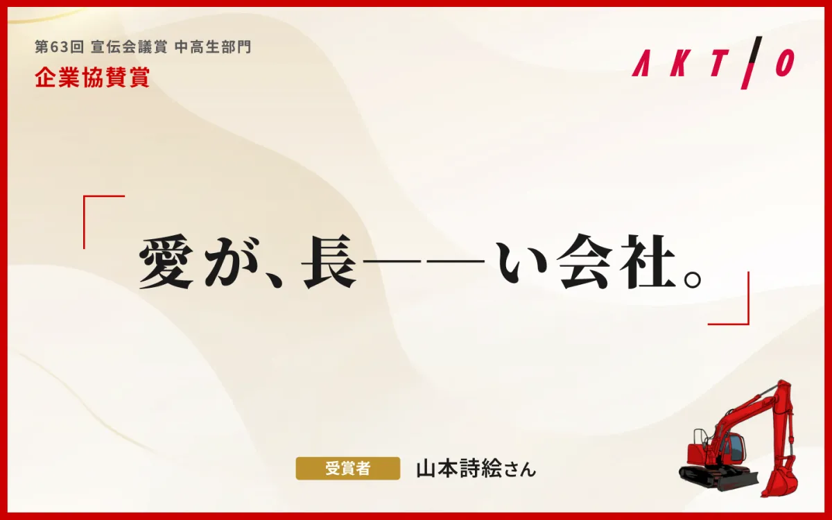今回の募集においては、アクティオの「建設機械レンタル」という業務を通じてどのように現場の人々に寄り添うか、その姿勢や魅力を反映したキャッチフレーズを求めていました。山本さんの「愛が、長ーーい会社。」はまさにその期待に応える作品として、多くの応募の中から輝きを放ちました。