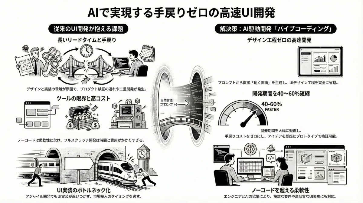 このサービスは、従来のUIデザイン工程を完全に省略し、直に画面を実装することを目的としています。これにより、開発プロセスが大幅に効率化され、最大で60%のスピードアップを実現しています。特に、デザインと実装の境界を消すことで、プロトタイプから本番コードまでを一気に作成することが可能となり、企業の開発者はよりクリエイティブな部分に集中できるようになります。