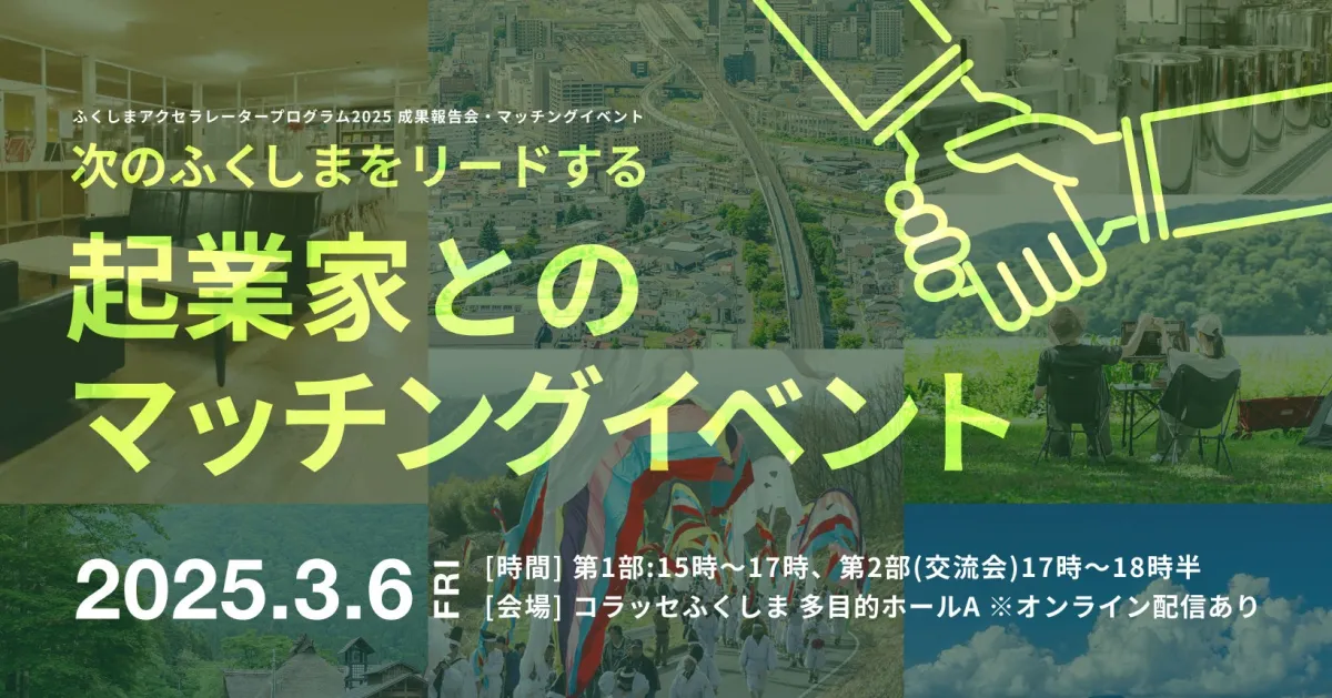 2026年3月6日、福島市で「ふくしまアクセラレータープログラム2025」の成果報告会が開催されます。福島県と株式会社全力優が協力し、地域の課題を解決しながら成長を目指す起業家たちが一堂に会するイベントです。このプログラムでは、過去1年間にわたり支援を受けた起業家たちが、自身の事業アイデアと成果を発表し、観客と直接コミュニケーションを図ります。