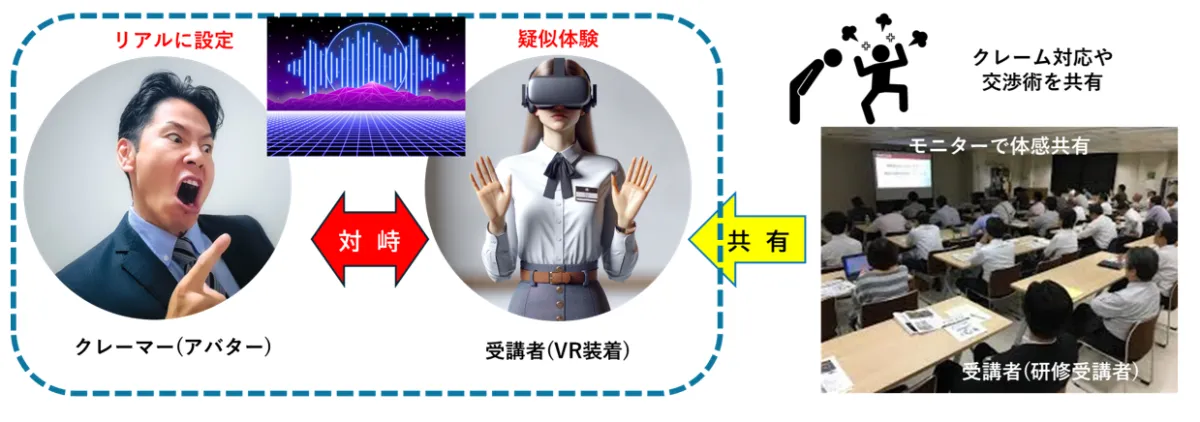 実際の現場での経験に基づいてカスタマイズされたシステムにより、個々の業界に特化したトレーニングが実現されます。また、他の受講者はVR体験中の参加者の様子をモニターで観察することができ、その体験を共有しながら学ぶことができます。このようにして、全員が一体感を持ちながら、効果的にクレーム対応能力を高めることが期待されます。