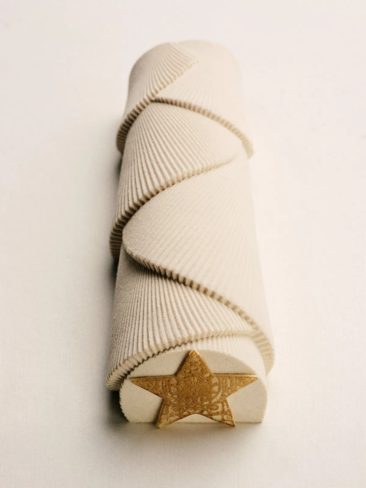 このブッシュ ド ノエルには、1950年にクリスチャン・ディオールがデザインしたフランシス・プーランクのオートクチュールドレスからインスパイアを受けた美しいデザインが施されています。特に、ベルベットのようなホワイトのプリーツ状の花びらが特徴的で、見る者を魅了します。この彫刻的な作品は、DIORメゾンの卓越した伝統技術と美的センスを見事に表現しています。