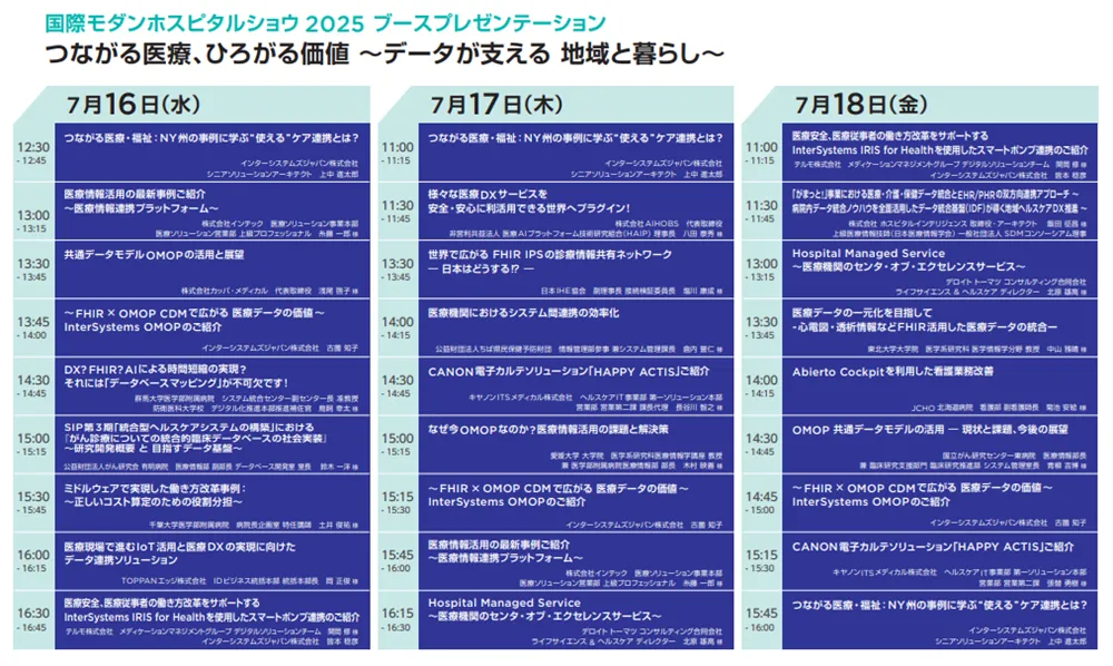 これに加え、インターシステムズの技術を活用した医療データの活用事例や、電子カルテ情報共有サービスへの取り組みも紹介される見込みです。