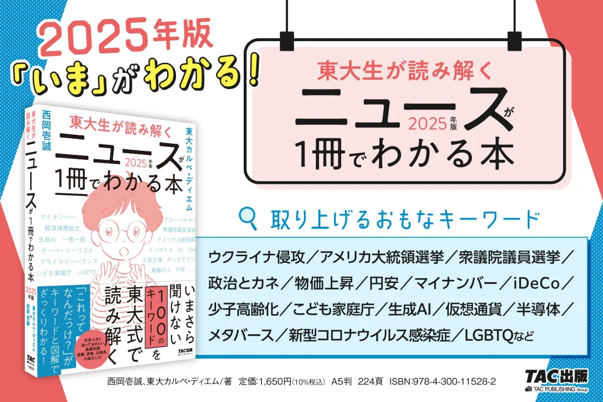 この度、TAC株式会社の出版部門から、注目の書籍『東大生が読み解く ニュースが1冊でわかる本 2025年版』が2025年1月26日に発売されます。この本は、現在の社会で起きている出来事や今後のトレンドを浮き彫りにするために選び抜かれた100のキーワードを踏まえ、ニュースをより良く理解するための手助けを行います。