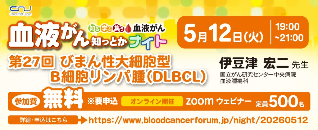 認定NPO法人キャンサーネットジャパンが主催する「血液がん知っとかナイト」は、2023年より毎月1回、血液がんについてのオンラインセミナーを開催しています。このたび、27回目となる2026年5月12日(火)のテーマは「びまん性大細胞型B細胞リンパ腫(DLBCL)」に決定しました。