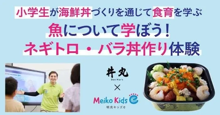夏休み中の小学生向けに、英語学童「Meiko Kids e」と海鮮丼専門店「丼丸」が共同で食育イベント「魚について学ぼう!ネギトロ・バラ丼作り体験」を開催します。
