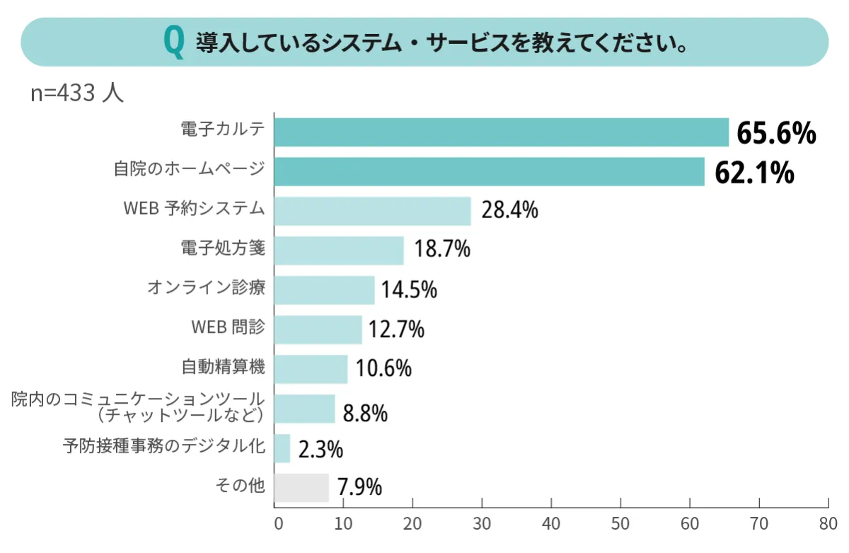 調査の結果、最も多かったのは「電子カルテ」の導入で、なんと65.6%の開業医が利用していることが判明しました。年齢層による差も顕著で、30代の医師では約90%が導入しているのに対し、60代以上では約50%と大きな差があります。さらに、自院のホームページの開設率も62.1%にとどまり、一般企業の93.2%と比較すると低水準であることが分かります。