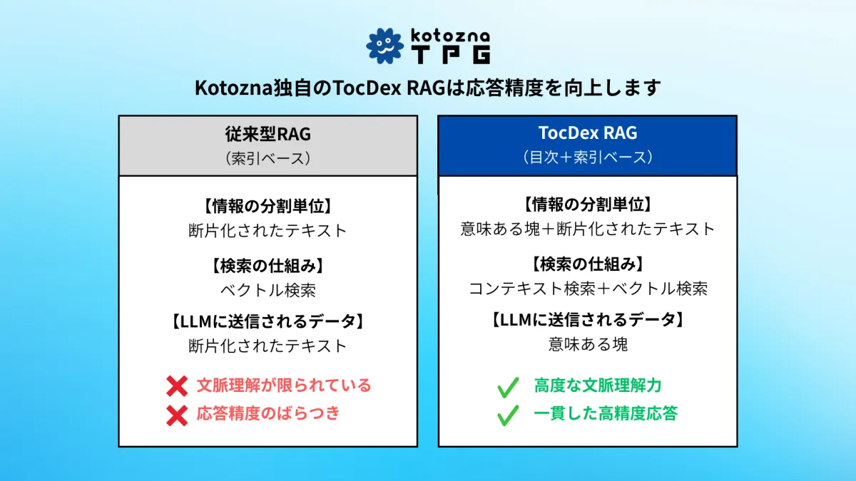 従来型と比較して、TocDex RAGは以下のような特長を持っています。
