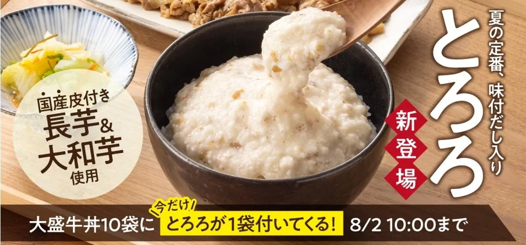 8月2日(金)10時までにキャンペーンページから「冷凍大盛牛丼の具10袋」5,832円(送料込)を購入した方には、「冷凍とろろ1袋(40g×2食入り)」を無料で同梱するプレゼントキャンペーンを実施するほか、数量限定のお得な特別セットをご用意しました。