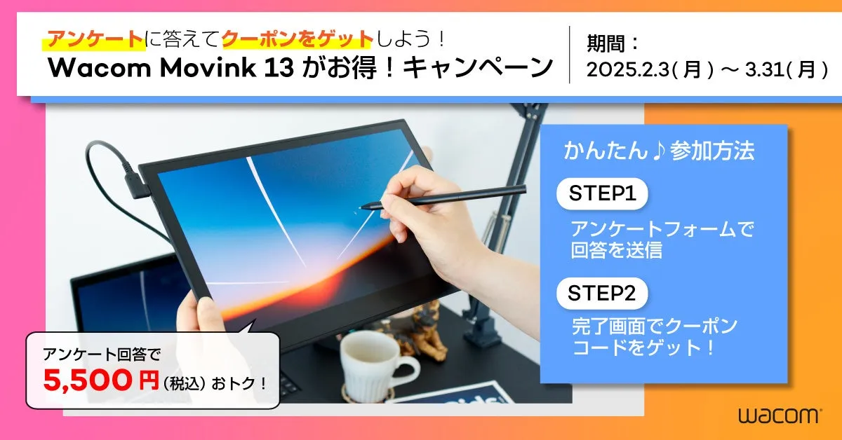 2025年2月3日から3月31日まで、株式会社ワコムは「アンケートに答えてクーポンをゲットしよう!Wacom Movink 13がお得!キャンペーン」を実施します。このキャンペーンでは、ワコムの製品に関するアンケートに答えるだけで、人気の有機ELペンタブレット「Wacom Movink 13」を5,500円割引で購入できるクーポンをプレゼントします。
