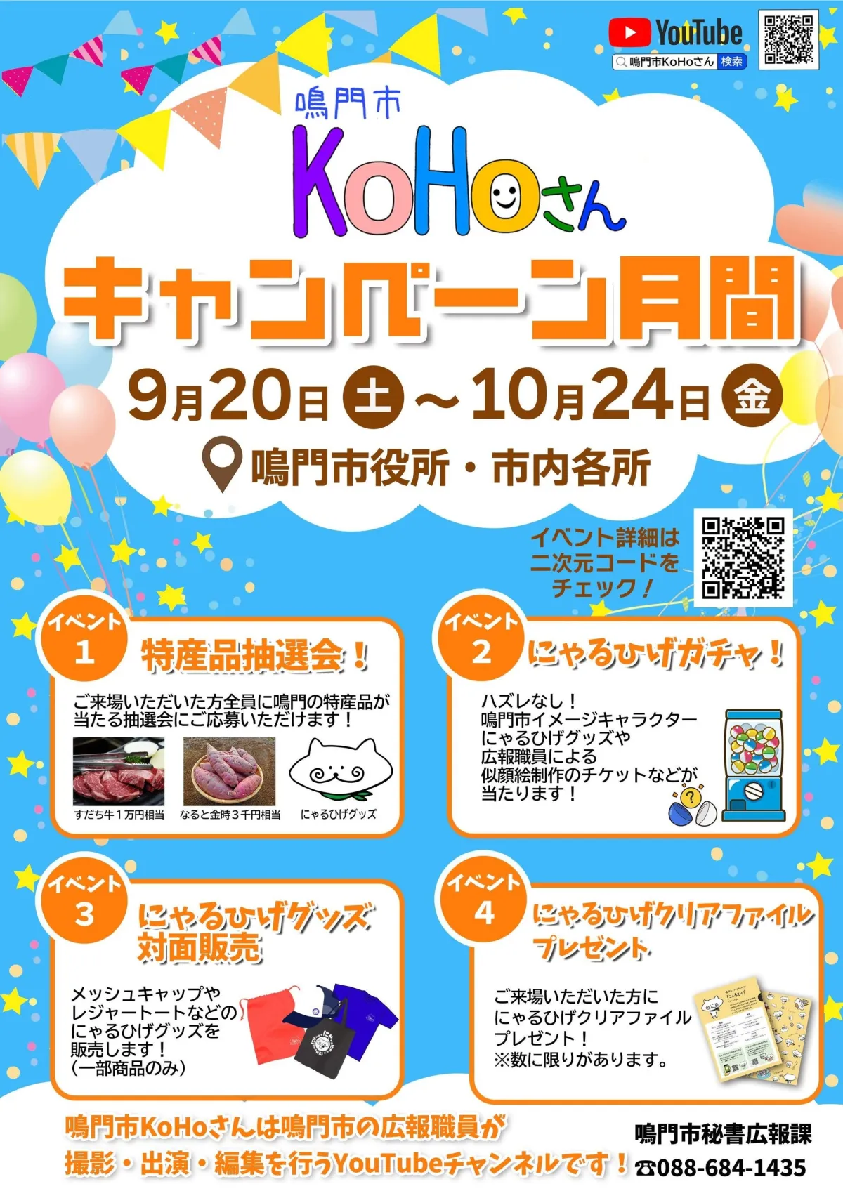 徳島県鳴門市から新たな取り組みとして、公式YouTubeチャンネル「鳴門市KoHoさん」のキャンペーン月間がやってきました。このキャンペーンは、2023年9月20日から10月24日までの約1か月間にわたり、地域の特産品や魅力を知ってもらうために各種イベントを開催することを目的としています。