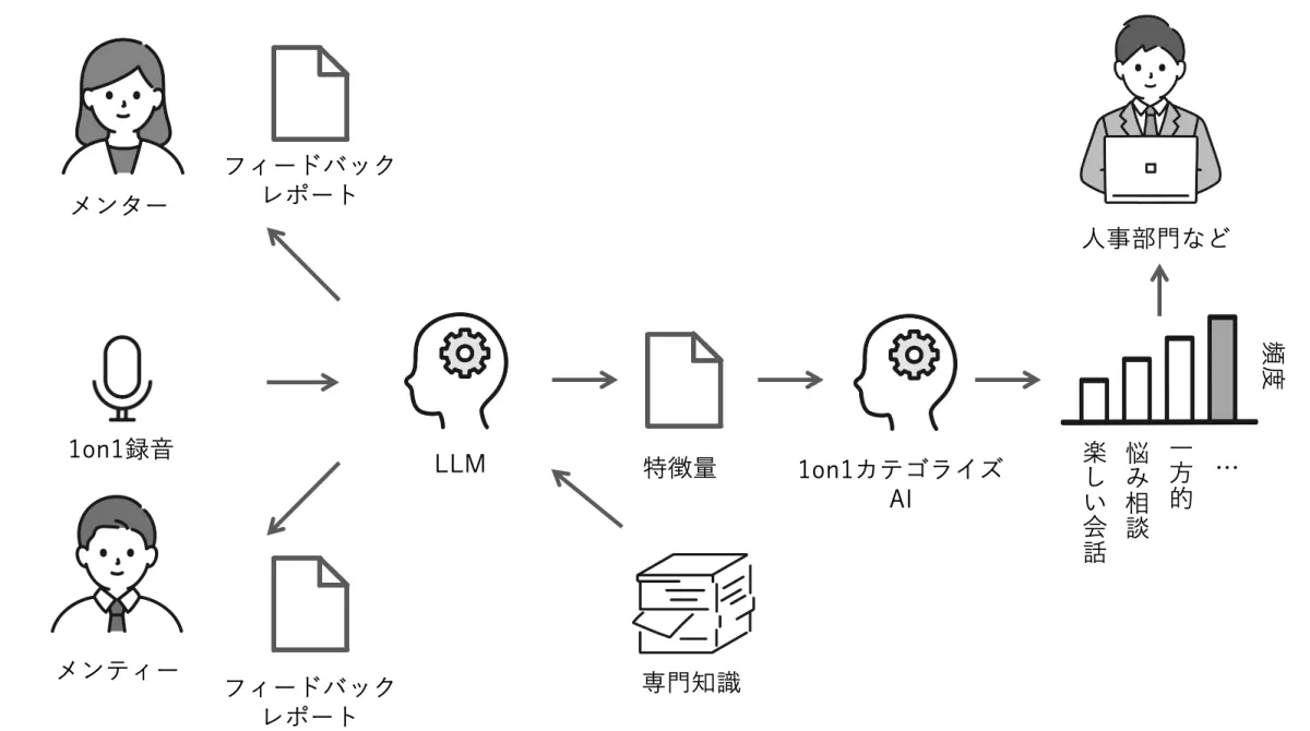この新しいサービスでは、1on1の音声データを分析し、その結果をもとにメンターとメンティそれぞれに向けた改善策を提案します。具体的には、心理学やマネジメント理論など、数々の専門知識を取り入れたLLMを用いて音声データを分析し、その結果を基にレポートを作成します。これにより、社内1on1の質を向上させるために必要なアドバイスが得られるのです。