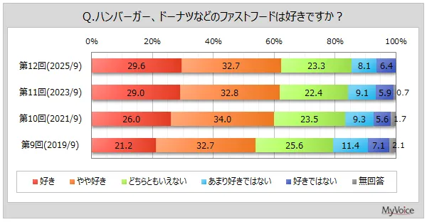 最近行われた調査によると、ファストフードが好きだと回答した人は6割以上に達することが明らかになりました。この傾向は特に女性において顕著であり、10代から40代の女性では、なんと8割前後がファストフードを好んでいるという結果が出ています。調査の実施は、2025年9月1日から7日の間に行われ、インターネットリサーチにより11,454名が回答しました。