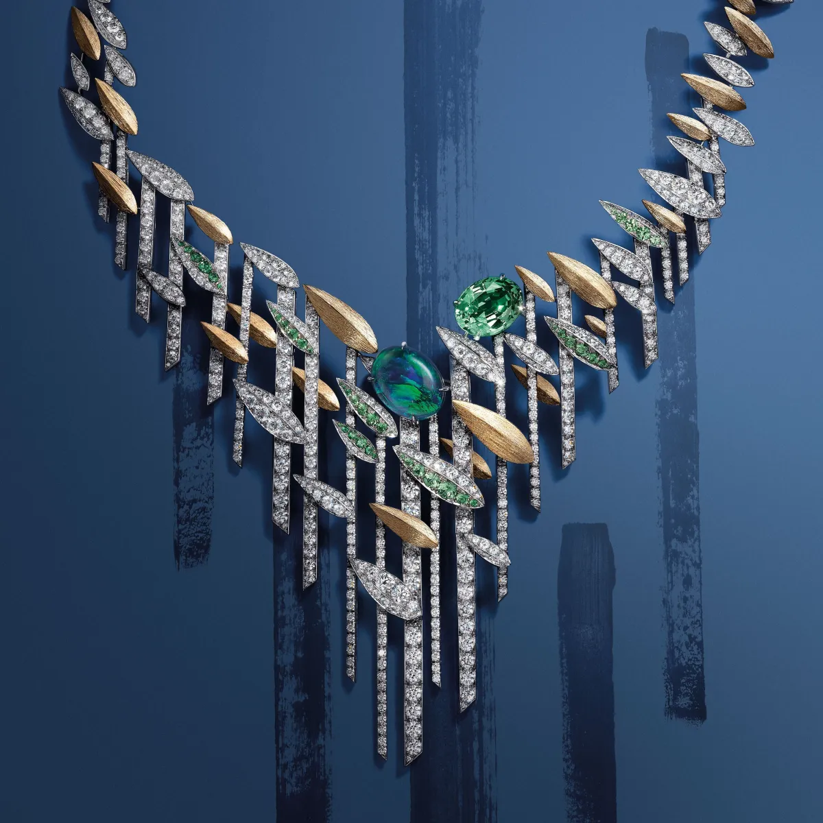 特に目を引くのが、ネックレス。これはメゾンの最初のミューズであった皇后ジョゼフィーヌの植物への愛情を受け継いだ作品で、創業者マリー=エティエンヌ・ニトが自ら「ナチュラリストジュエラー」と称して以来、ショーメが自然の傑作をジュエリーの形で昇華させ続けてきたことを象徴しています。