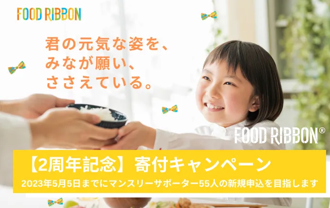 フードリボンプロジェクトは、2023年5月6日に設立2周年を迎えます。それを記念して、寄付キャンペーンを実施することにしました。このキャンペーンの目標は、マンスリーサポーター55人を新たに募ることです。この支援を通じて、全国の飲食店にフードリボンのスキームをさらに広め、子どもたちに提供できる食事の数を増やしていきます。