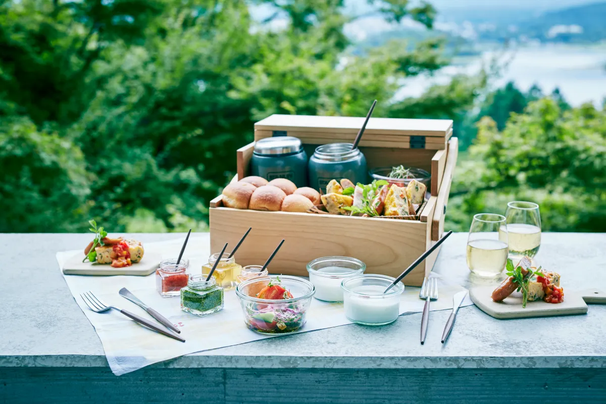 滞在初日は、「モーニングBOX」で春の食材を楽しむところから始まります。河口湖を眺められるキャビンのテラスで、焼きたてのダッチオーブンブレッドや、菜の花・タケノコを使ったオムレツ、ソーセージなどを詰め込んだ豪華な朝食を味わっていただきます。これにより、朝の爽やかさと共に新たな一日のスタートを切ることができます。