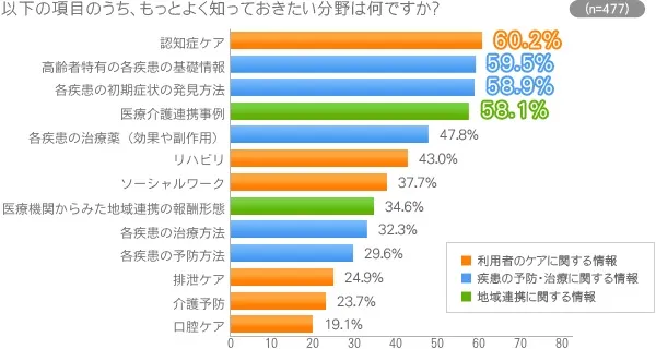 調査によると、ケアマネジャーが特に知りたい情報は「認知症ケア」で、60.2%の respondents がこの情報を高く評価しました。次いで「高齢者特有の各疾患の基礎情報」(59.5%)や「各疾患の初期症状の発見方法」(58.9%)が続いています。また、医療と介護の連携事例(58.1%)、さらには各疾患に対する治療薬の効果や副作用(47.8%)に関する情報も重要視されています。これらのデータから、疾患の予防や治療に関する情報がケアマネジャーにとって重要なテーマであることが見て取れます。
