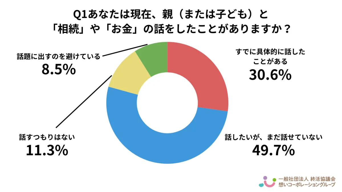 調査は2025年11月に行われ、435名が参加しました。その結果、多くの家庭が相続やお金について話し合っていないことが明らかになりました。具体的には、親や子どもと「相続」や「お金」の話をしたことがあると答えた人はわずか30.6%で、約半数にあたる49.7%は「話したいが、まだ何も話せていない」としています。