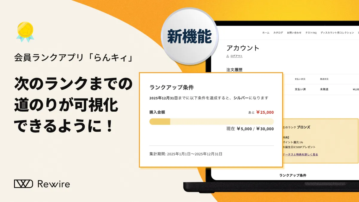 株式会社リワイアが提供する会員ランクアプリ「らんキィ」に新たな機能が追加されました。この機能は、会員が次のランクに到達するための具体的な条件をアカウントページに可視化するものです。これにより、顧客は次回のランク更新日までに必要な購入金額や回数を一目で把握することができるようになります。