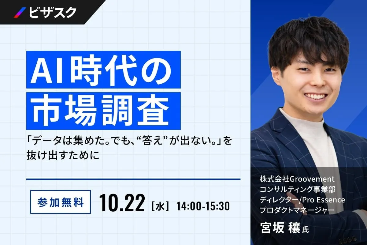 株式会社ビザスクは、10月22日(水)14:00より、『AI時代の市場調査』をテーマにした無料オンラインセミナーを開催します。このセミナーは、グローバルなナレッジプラットフォームを運営する当社が、企業の新規事業開発やデジタルトランスフォーメーション(DX)推進を支援する一環として企画されました。登壇するのは、株式会社Groovementのコンサルティング事業部のディレクターである宮坂穰氏です。