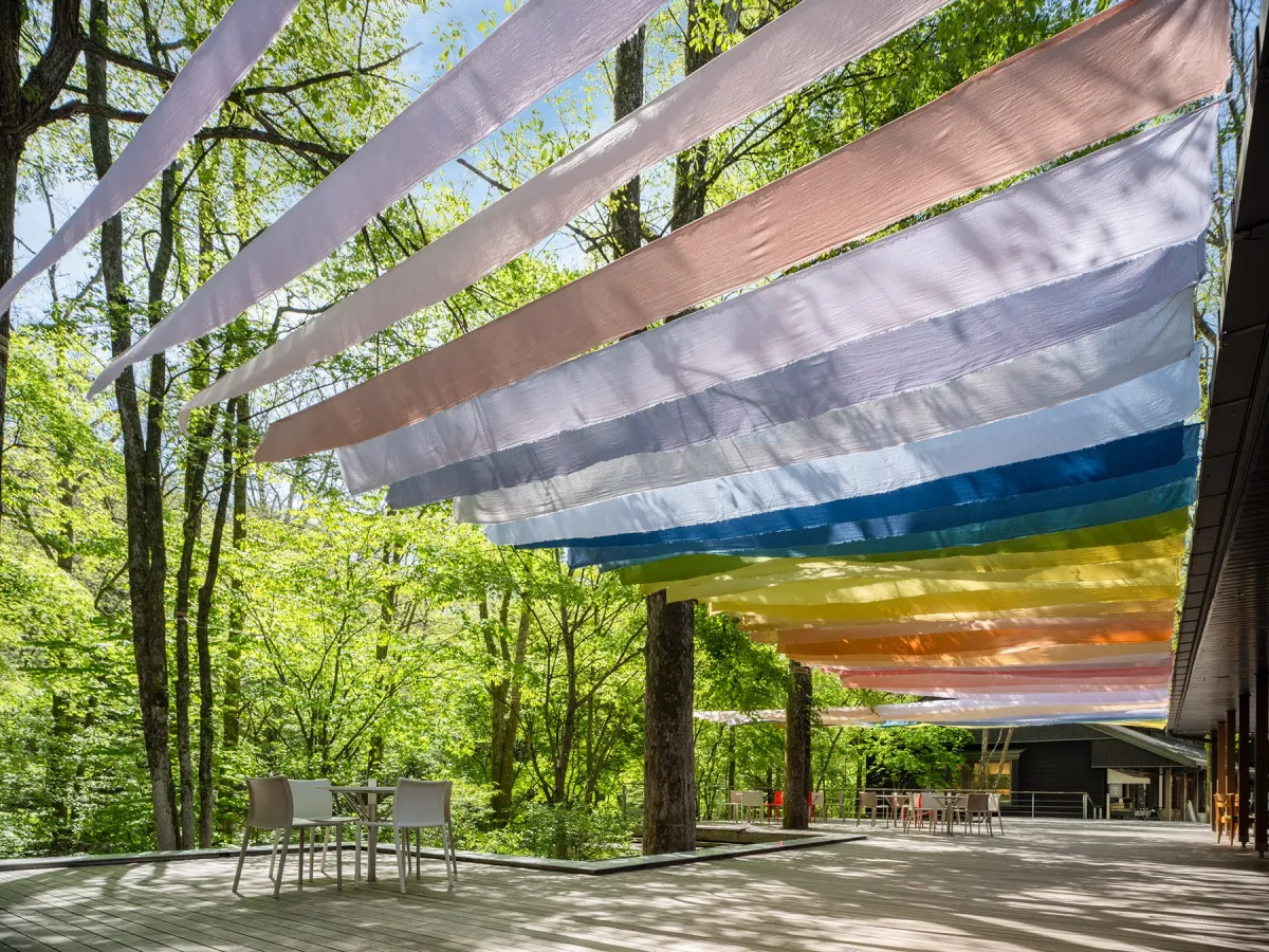 ハルニレテラスは「軽井沢の日常」をテーマにしていますが、このインスタレーションは自然環境への配慮を基にしたデザインで、周囲の新緑の木々や青空と見事に調和しています。星野エリアでは、環境との共生を大切にしながら持続可能なリゾートの運営に取り組んでおり、このイベントもその一環。69本以上のハルニレの木が自生するこの地で、心地よい自然の中でアートを楽しむ特別な空間が生まれます。