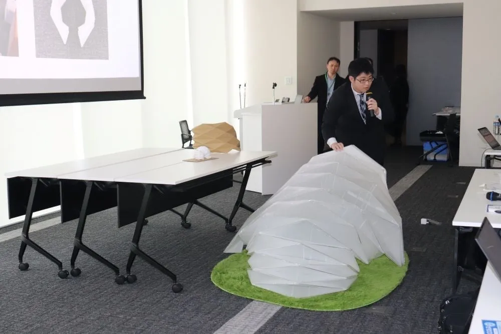 最優秀賞は、発達障害や感覚過敏を持つ人々のための「持ち運び可能なカームダウンスペース」を発表した工学部建築学科4年の植村陸吐さんが受賞。日本の折り紙技術を利用し、社会課題を解決する独創的なアイデアが高く評価されました。その他にも、armや足の機構、IoT火災検知アラーム、視覚障がい者向けデバイスなど、多様な受賞作品が並びました。