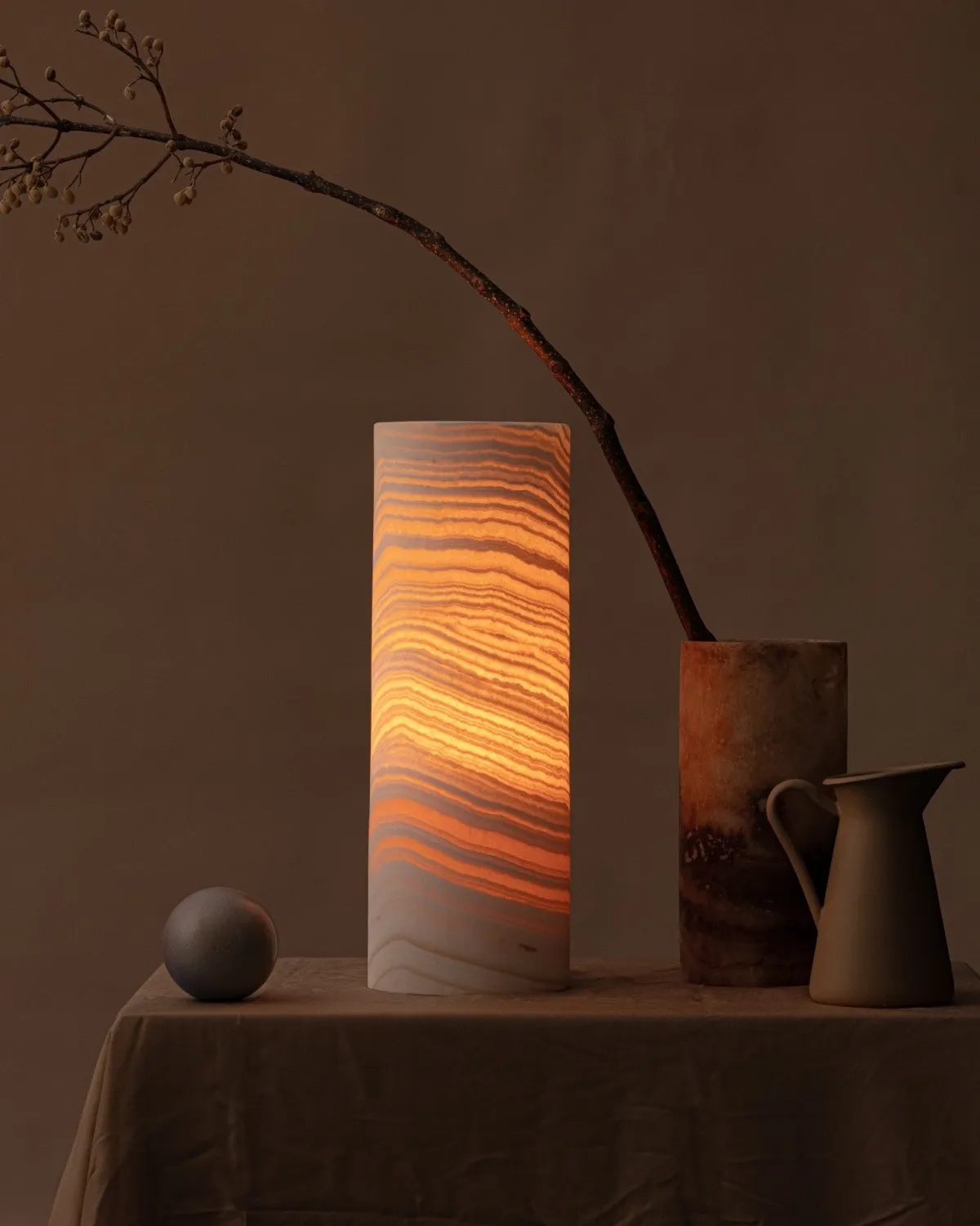アラバスターは大理石の一種とされ、透光性のある特性を持つことから横たわる美しさがあります。かつてガラスが重宝されなかった時代には、アラバスターが窓の代用品として使われたこともあった歴史ある素材です。無機質な姿のアラバスターも光源がともることで、その芸術性がより際立ち、周囲に優しい明るさをもたらします。