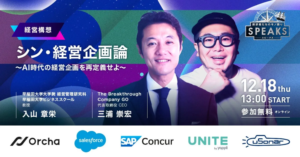 2025年12月18日にオンラインで開催されるイベント『SPEAKS ‐ 経営企画リーダーズサミット‐』では、早稲田大学大学院 経営管理研究科の入山章栄教授と、The Breakthrough Company GOの三浦崇宏CEOが基調講演を行います。このセミナーは、AIの導入によって大きな転換期を迎えている経営企画の役割について考察することを目的としています。